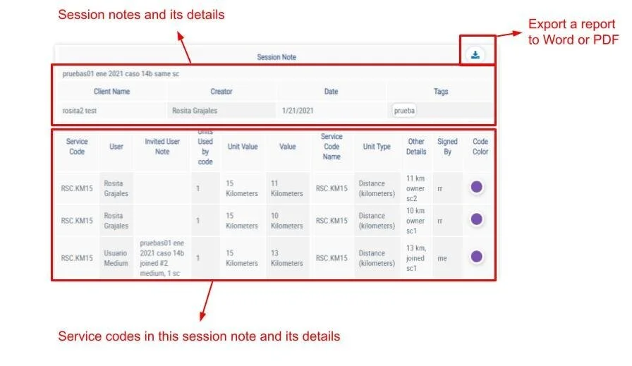 The Session Notes Summary table has changed in the Session Notes Dashboard. Now you will be able to see under each session note the related service code details and the session note details. See below for a closer look at each.